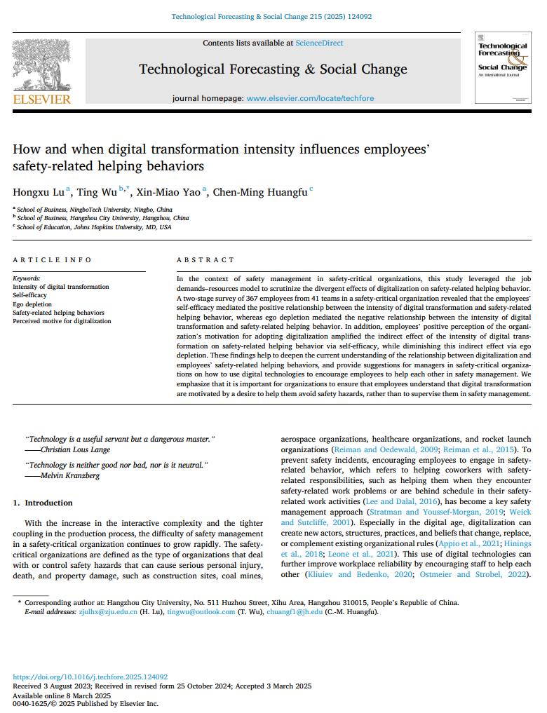 近日,商学院卢红旭博士作为第一作者发表的研究论文《How and when digital transformation intensity influences employees' safety-related helping behaviors》在数字化和创新管理领域重要期刊《Technological Forecasting and Social Change》第215卷(2025年)正式发表。该期刊是国际权威学术期刊之一(4/302),主要探讨数字技术预测与未来科学的发展与实践。根据JCR最新统计,该期刊影响因子为12.90,属于SSCI一区、中科院管理类top期刊。该论文由投稿到发表历时一年半,由卢红旭博士和其团队两位本科生(姚欣苗,久久精品一区二区三区四区|日韩欧美福利视频_欧美黑人巨大videos精品_欧美黑人巨大xxxxx_欧美黑人乱大交_欧美黑人乱大交_欧美黑人牲交videossexeso_欧美黑人添添高潮a片www_欧美黑人添添高潮a片www_欧美黑人性暴力猛交喷水黑人巨大商学院203财务管理本科生;皇甫辰鸣,久久精品一区二区三区四区|日韩欧美福利视频_欧美黑人巨大videos精品_欧美黑人巨大xxxxx_欧美黑人乱大交_欧美黑人乱大交_欧美黑人牲交videossexeso_欧美黑人添添高潮a片www_欧美黑人添添高潮a片www_欧美黑人性暴力猛交喷水黑人巨大商学院191财务管理本科生)及另外一位合作者共同完成。